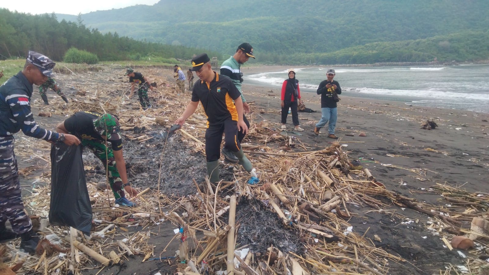 Sejumlah personel Polsek Puger yang merupakan jajaran Polres Jember Polda Jatim bersama anggota TNI dan masyarakat gotong royong menyisiri pantai, mengumpulkan sampah kayu, bambu, serta limbah yang terbawa arus laut dan berserakan di sepanjang pantai.