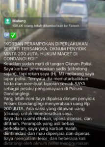 Di tengah proses penyidikan yang masih berjalan, muncul unggahan di TikTok dengan narasi menggunakan sudut pandang “saya” yang menyebut adanya dugaan paksaan dari penyidik Polsek Gondanglegi untuk menyiapkan uang sebesar Rp200 juta. Unggahan tersebut dengan cepat menyebar luas dan memicu spekulasi publik, bahkan menimbulkan persepsi negatif terhadap aparat penegak hukum.