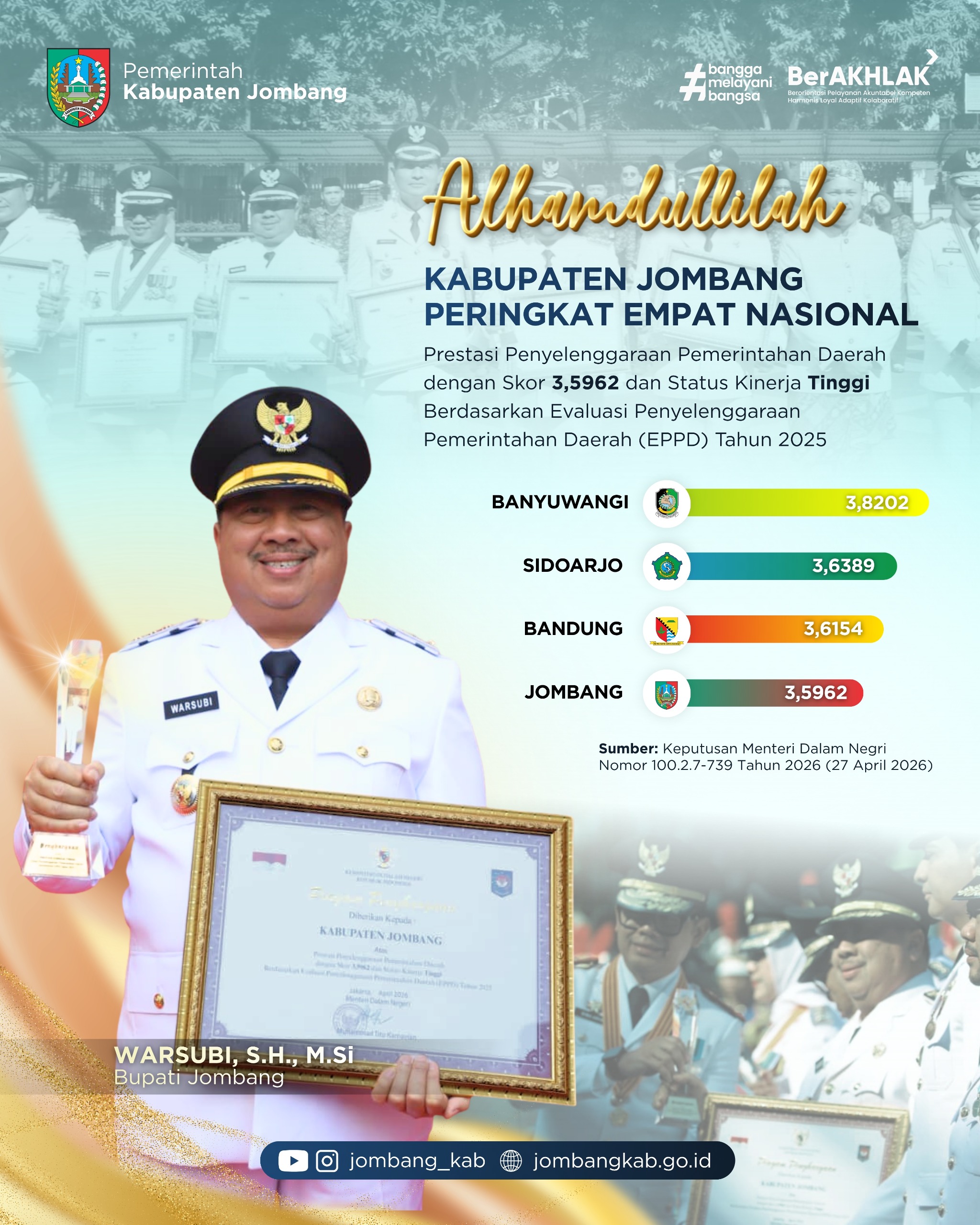Penghargaan yang diterima oleh Bupati Warsubi merupakan bentuk pengakuan resmi dari Pemerintah Pusat melalui Kementerian Dalam Negeri RI atas keberhasilan Kabupaten Jombang dalam menyelenggarakan pemerintahan daerah yang efektif, transparan, dan akuntabel sepanjang tahun 2025.